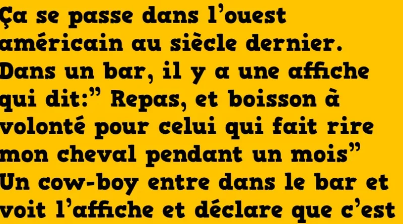 Dans un bar, il y a une affiche qui dit:” Repas, et boisson à volonté pour celui qui fait rire mon cheval pendant un mois”