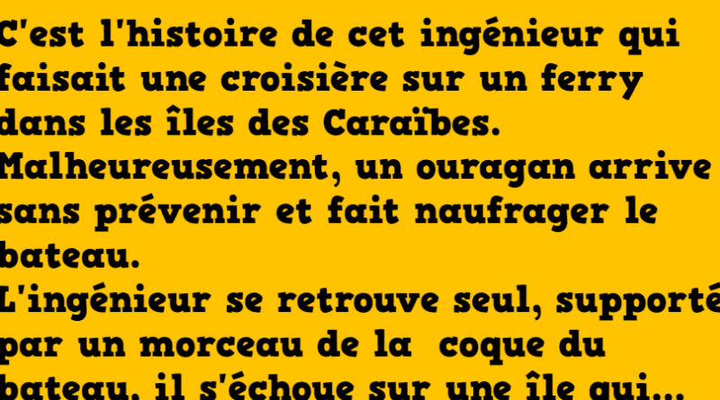 C’est l’histoire de cet ingénieur qui faisait une croisière sur un ferry dans les îles des Caraïbes. Malheureusement, un ouragan arrive sans prévenir et fait naufrager le bateau.