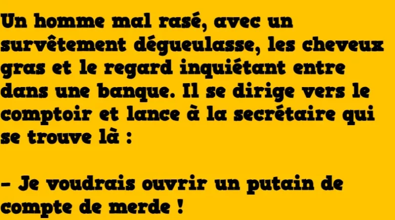 Un homme mal rasé, avec un survêtement dégueulasse, les cheveux gras et le regard inquiétant entre dans une banque. Il se dirige vers le comptoir et lance à la secrétaire qui se trouve là :