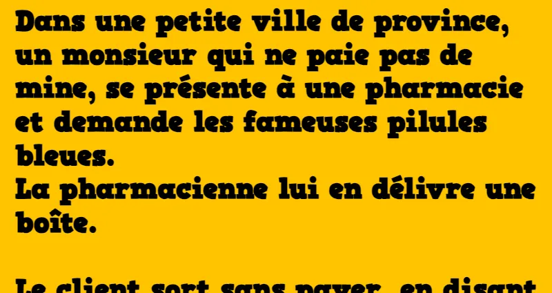 Dans une petite ville de province, un monsieur qui ne paie pas de mine, se présente à une pharmacie et demande les fameuses pilules bleues.