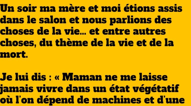 Je lui dis : « Maman ne me laisse jamais vivre dans un état végétatif où l’on dépend de machines et d’une bouteille. Si tu me vois dans cet état, débranche les machines qui me maintiendront en vie. Je préfère partir ! »