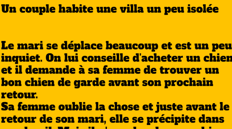 Le mari se déplace beaucoup et est un peu inquiet. On lui conseille d’acheter un chien et il demande à sa femme de trouver un bon chien de garde avant son prochain retour.