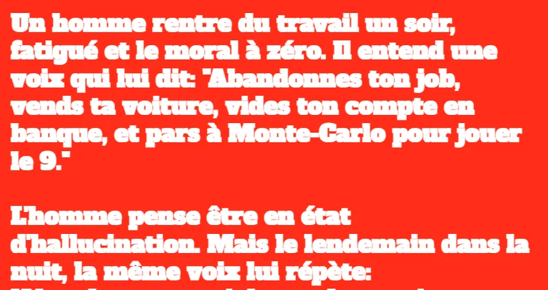 Un homme rentre du travail un soir, fatigué et le moral à zéro. Il entend une voix qui lui dit: « Abandonnes ton job, vends ta voiture, vides ton compte en banque, et pars à Monte-Carlo pour jouer le 9. »